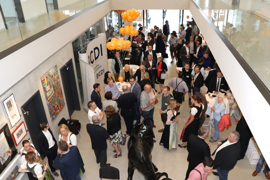 Zum Ende der Veranstaltung versammelte sich schließlich das gesamte Team rund um Thomas Müller vor dem „Haus der Börse“, um hunderte orange Luftballons mit der Botschaft „46,3% Gewinn in 3 Jahren! Happy Birthday BCDI!“ in den Himmel aufsteigen zu lassen.